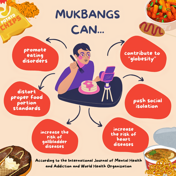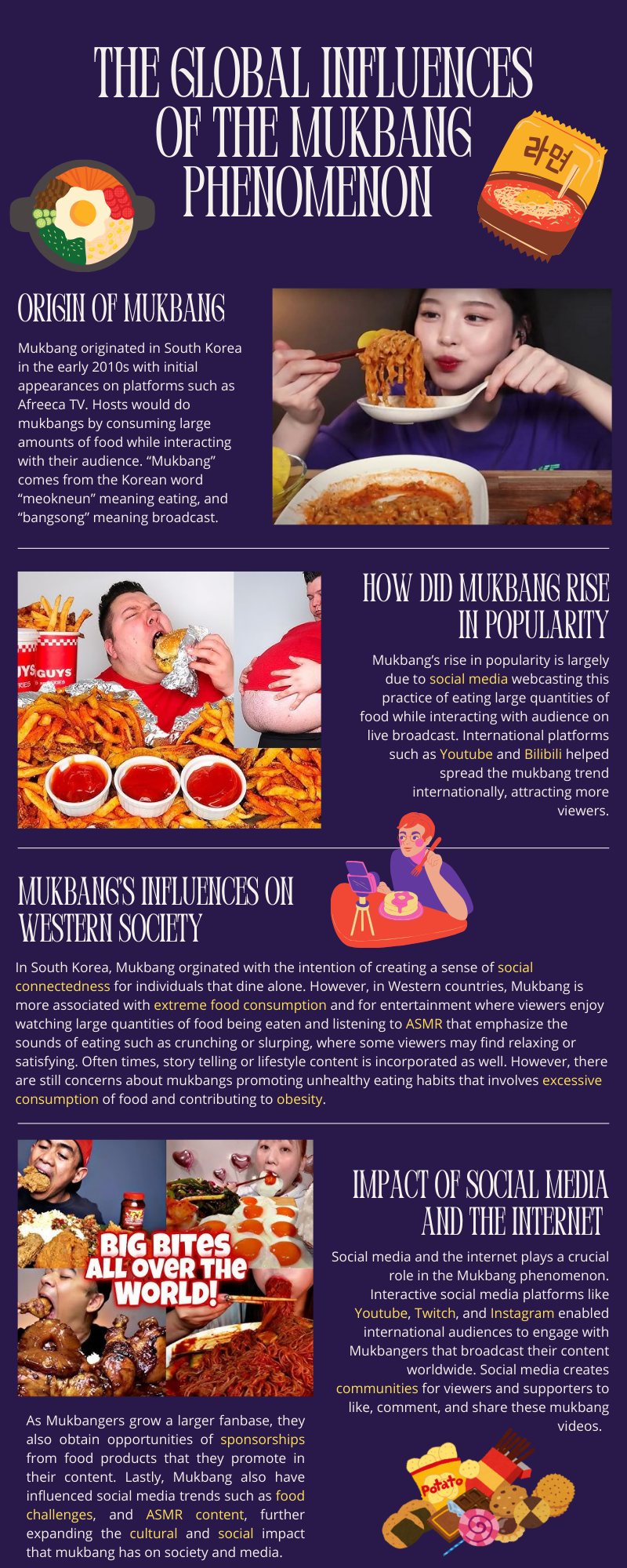 As mukbang globalizes, it is changing how people across the world view food, media, and consumption as it expands from a South Korean-only internet trend to a global, cultural and economic phenomenon. Mukbang, which initially known for its communal dining experience, has evolved to appeal to a wide range of global consumers by merging aspects of influencer marketing and sensory-rich ASMR. Companies are leveraging mukbang's success by collaborating with influencers to promote products and expand markets, driving economic growth in the food and entertainment sectors. Global viewers of mukbang are exposed to Korean cuisine, eating customs, and social dynamics, which draws their interest in Korean culture and global food trends resulting in a larger demand for imported products worldwide. Mukbang is an economic catalyst by becoming an effective medium for global food marketing. The globalization of mukbang not only fosters economic growth and exchange between cultures, but it also draws attention to the complications associated with modern digital consumption. Specifically, the harmful implications of overindulging in digital media for viewers and the negative psychological effects it can have on them.