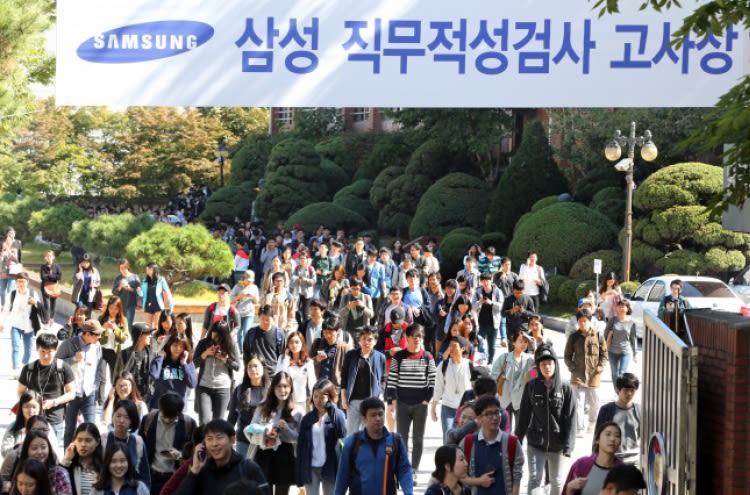 Applicants come out of a high school in Gangnam, southern Seoul, last October, after taking the Samsung Aptitude Test.